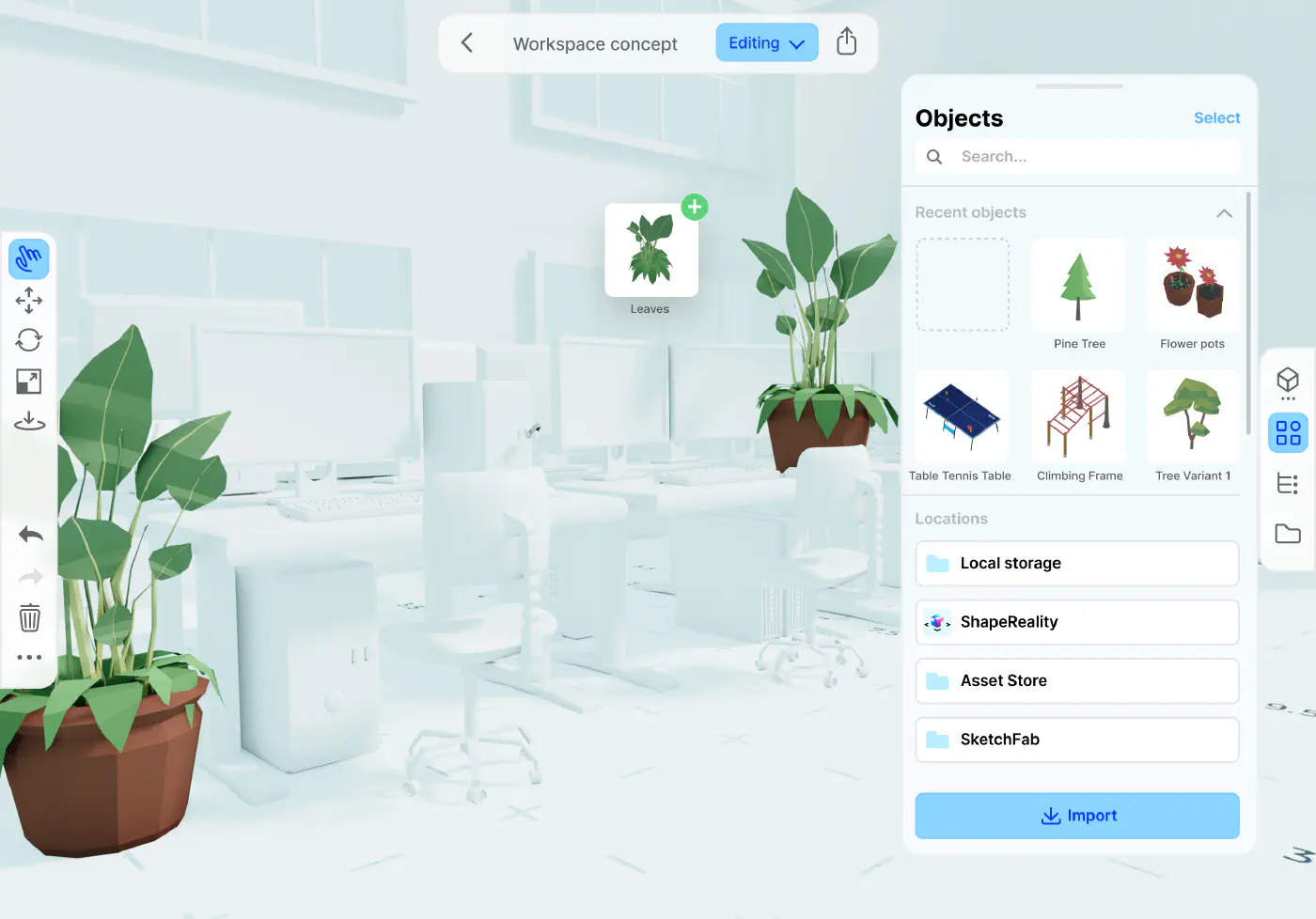 The goal of the design app was to give as much creative freedom as possible, while still allowing children to create something beautiful in under 15 minutes. To achieve this, the app contains a library of common objects, which can be placed in the world in any way.